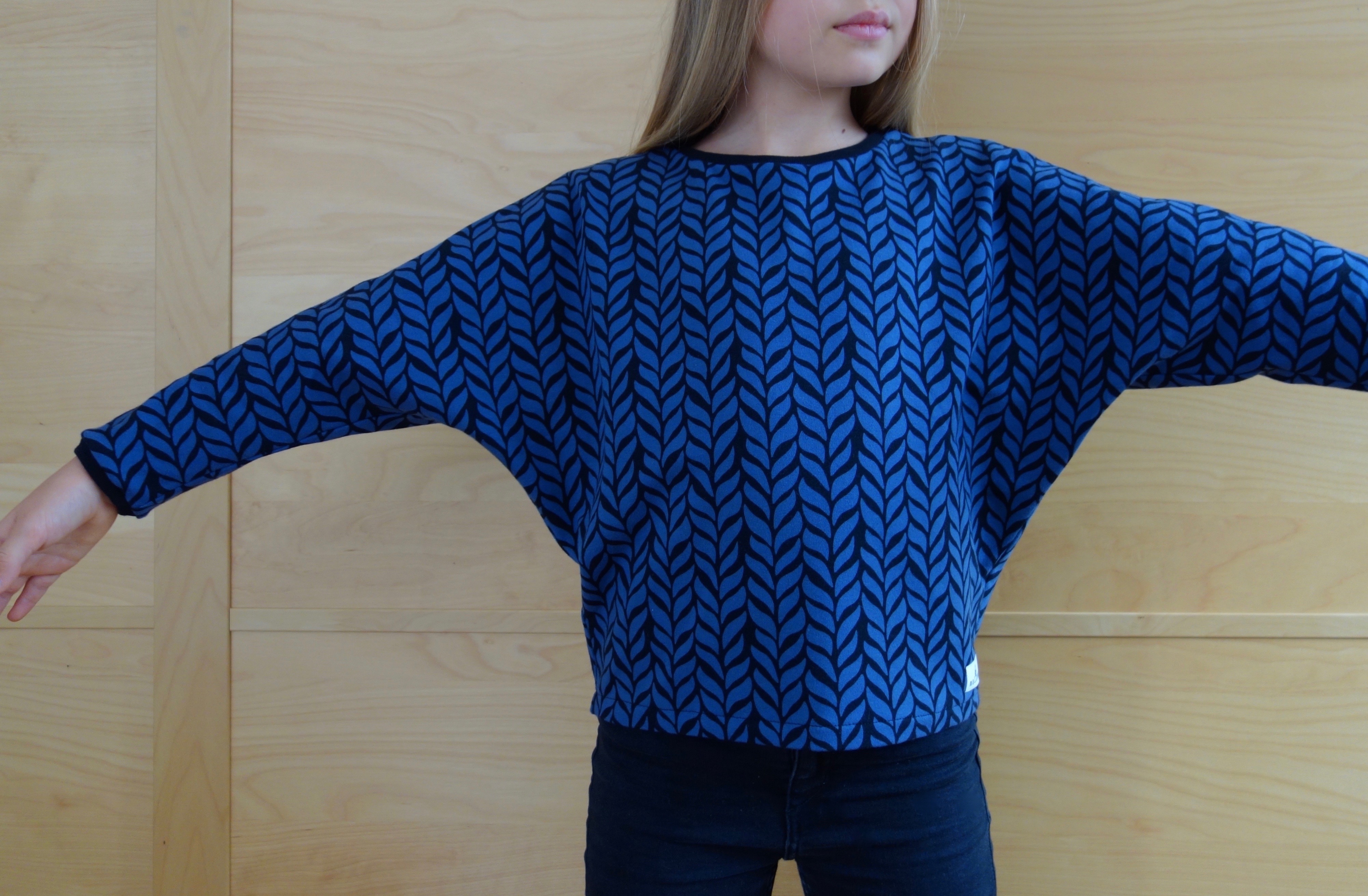 Das Fledermausshirt mit langen oder ¾-Ärmeln ist die coole und bequeme Wahl für die etwas älteren Mädchen. Wähle deinen Lieblingsstoff (Sommer-Sweatshirt oder Jersey) und eine passende Bündchenfarbe dazu. Das Shirt kann in den Grössen 122/128 und 134/140 bestellt werden.