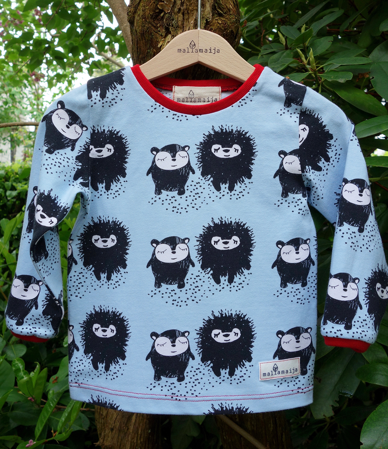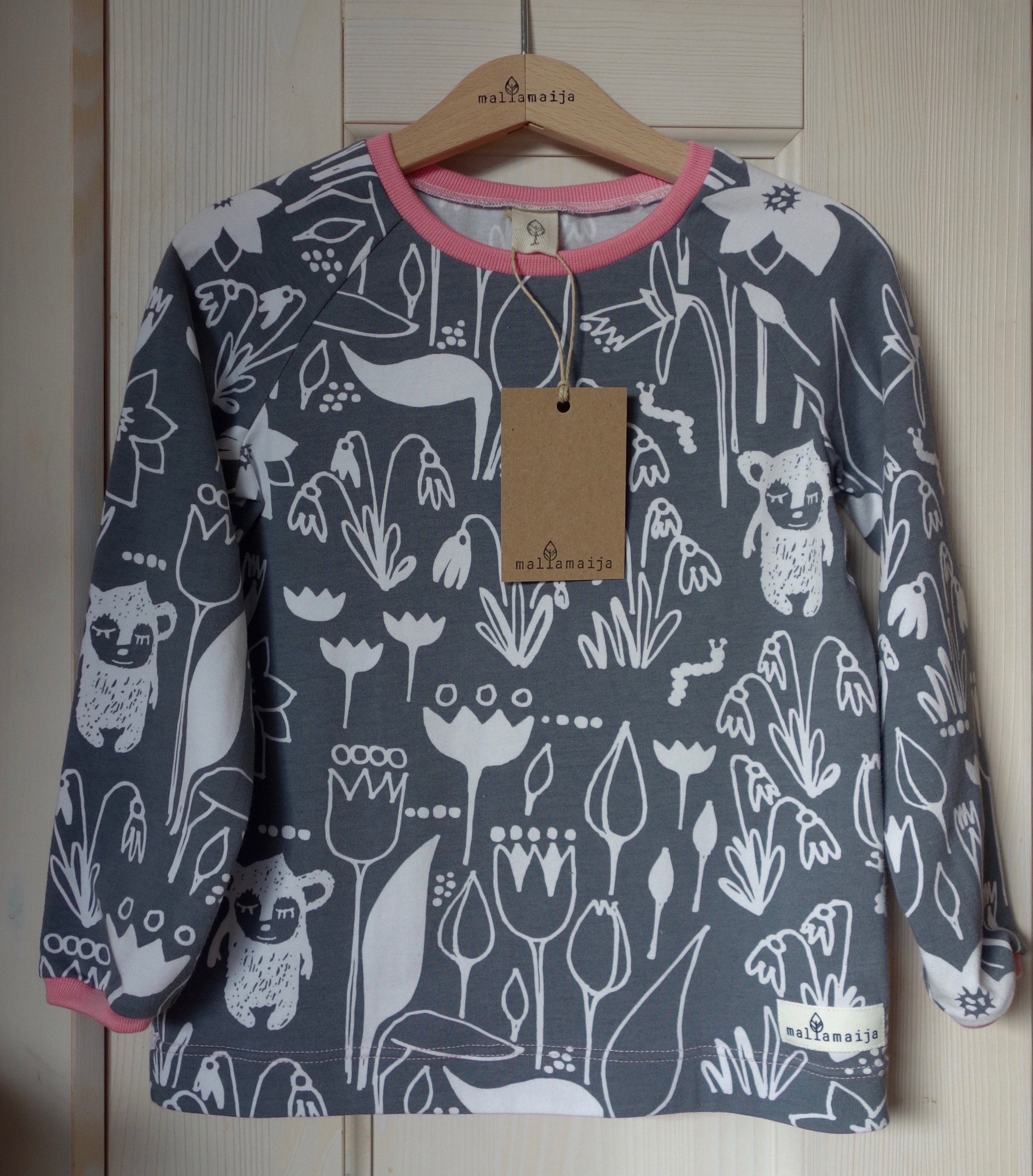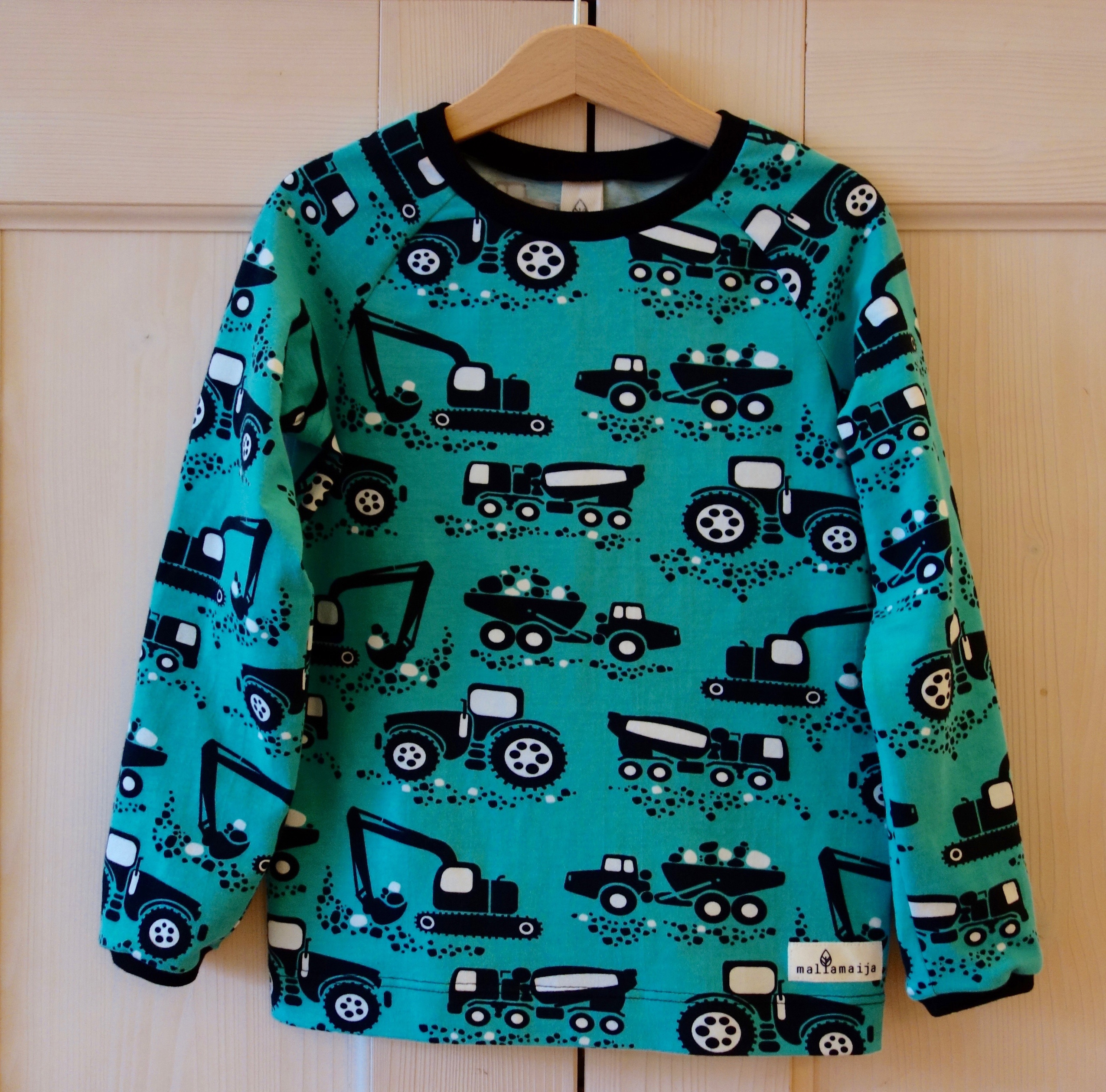 The t-shirt can be ordered in size 62/68 – 134/140. From size 92/98 onwards the t-shirt is raglan-sleeved.